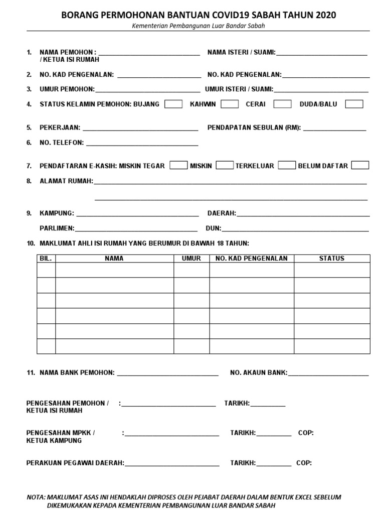 Dan memberi sokongan moral mengikut prinsip-prinsip kerja sosial kepada individu atau keluarga yang ditimpa musibah supaya mereka boleh berdikari atau berusaha ke. Inisiatif Baharu Kerajaan Negeri Sebagai Manifestasi Harapan Tinggi Kita. BORANG PERMOHONAN BANTUAN AM TERMA DAN SYARAT Syarat-syarat permohonan iWarganegara Malaysia yang berasal dari Negeri Sabah dan salah seorang ibu atau bapa pemohon berasal dan dilahirkan di Sabah iiBorang permohonan hendaklah diisi dengan lengkap beserta salinan dokumen yang diperlukan.